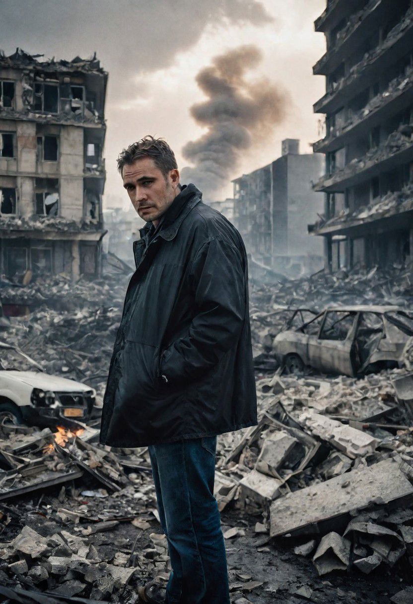 Photo of a man who is standing looking at how his city has been destroyed by a nuclear bomb. He has just arrived at the disaster and observes the horror of the destruction, ruined buildings full of smoke and flames, ground full of rubble with skeletons lying around In the dawn light floods the scene, the man is completely dressed in normal clothes and wet, he is dirty, everything is a disaster, the sky is cloudy and it is raining, , Fujifilm XT3,film still,film grain,cinematic,soldier accessories,war style, professional photo,best quality and best aesthetic,Award-winning artistic photos,Outdoors,public places,defeated posture, ( detailed in background:1.6)Serious,Curi