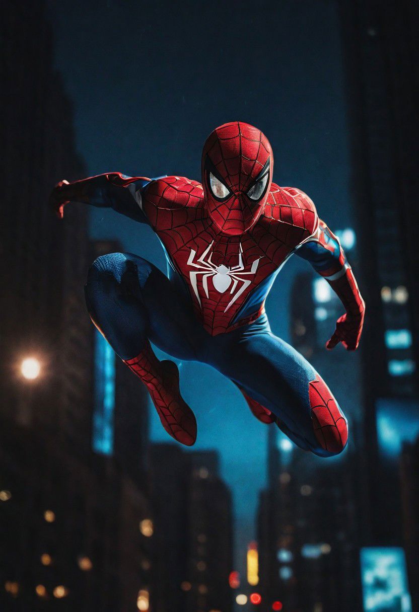 Portrait face Solo spiderman flying in new york , photograph ,pale beautiful photo, ultra detailedspiderman suit , night time, cinematic composition, cinematic filtering