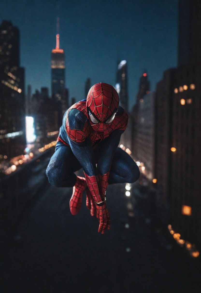 Portrait face Solo spiderman flying in new york , photograph ,pale beautiful photo, ultra detailedspiderman suit , night time, cinematic composition, cinematic filtering