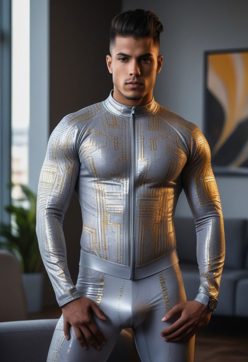a strong 24-year-old brazillian hunk male, with a buzz undercut hairstyle, detailed face, mindless expression, wearing a skin tight light-gray rubber suit with silver and gold electronics circuits patterns, wearing a light-gray rubber jockstrap, on a modern living room, standing at attention pose, full body visible, looking at viewer, portrait, photography, detailed skin, detailed rubber texture, realistic, photo-realistic, 8k, highly detailed, full length frame, High detail RAW color art, diffused soft lighting, shallow depth of field, sharp focus, hyperrealism, cinematic lighting