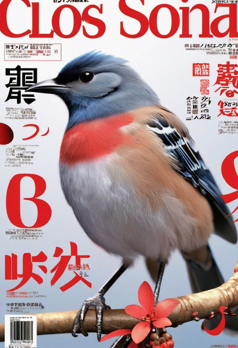 magazine cover, japanese text, bird, clos-up, 3D animation style,