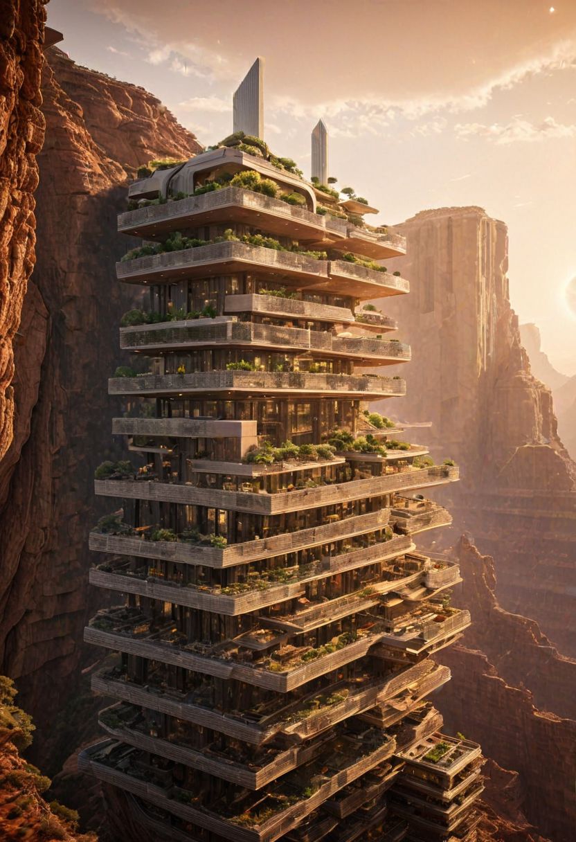 (The colonial city of the future, in the mist-filled Grand Canyon, on an unknown Earth-like planet, 2 moon on sky, Spaceship flight connects colonies:1.3), (Richard Meier:1.2), (Mario Botta:1.3), (avant-garde, future, reality, science fiction, photorealistic), (modern architecture:1.2), (Large Files, Ultra Realistic, 8K, 16k, FHD, HD, VFX, Perfect, Photography, composition, Architecture Sales Photography, Architecture Competition, Ultra High Resolution, Cinematography, High Resolution Image:1.1), (dramatic lighting, direct sunlight, ray tracing, clear shadow:1.2), (real landscape:1.1), (blurred background:1.0), (urban background, more_details) , ac_neg1, great lighting, clear, xtower, industrialbuilding, futureskyline, stacked