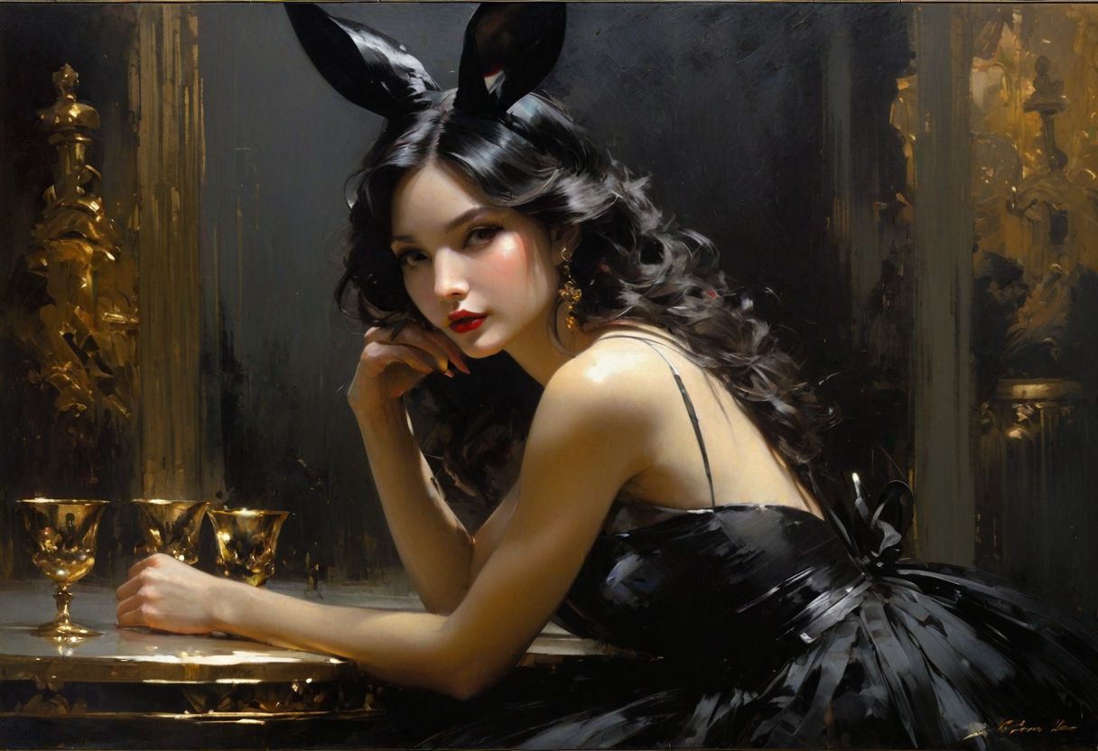 black rabbit, masterpiece, award wining, trending, , high quality, delicate, oil painting, by Jeremy Mann, Pino Daeni