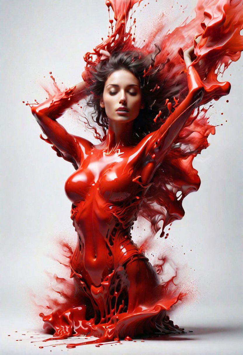 abstract figure resembling a woman torso, no distinguishable features, sculpted from flashy red glossy material, fluid melting appearance, parts dripping stretching towards ground, Engulfed BY red, minimalist plain white background, vibrant flashy red color, stark contrast