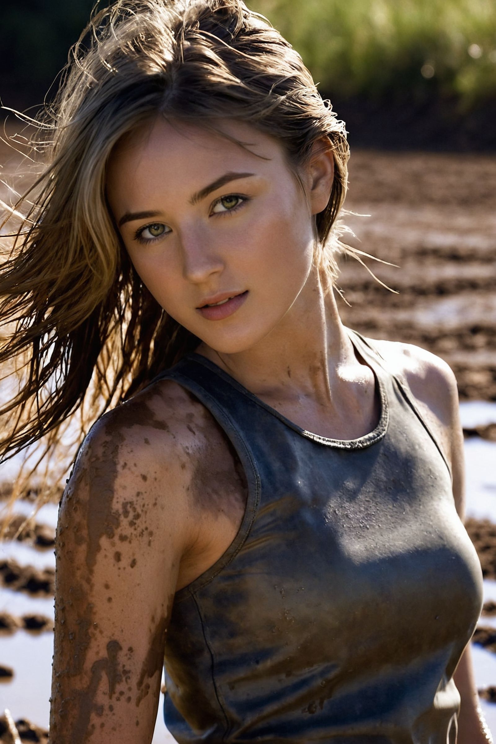 (a muddy Beautiful girl:1.8), (muddy on face:1.8), (muddy on body:1.8), wearing boyshorts, very skinny, skin-tight tank top, midriff, ((muddy)), (muddy on boots), (sunlight, shadow:1.4), ultra highres, sharpness texture, High detail RAW Photo, detailed face, shallow depth of field, (realistic skin texture:1.4), (freckles, moles:0.4), dslr, film grain, Fujifilm XT3,