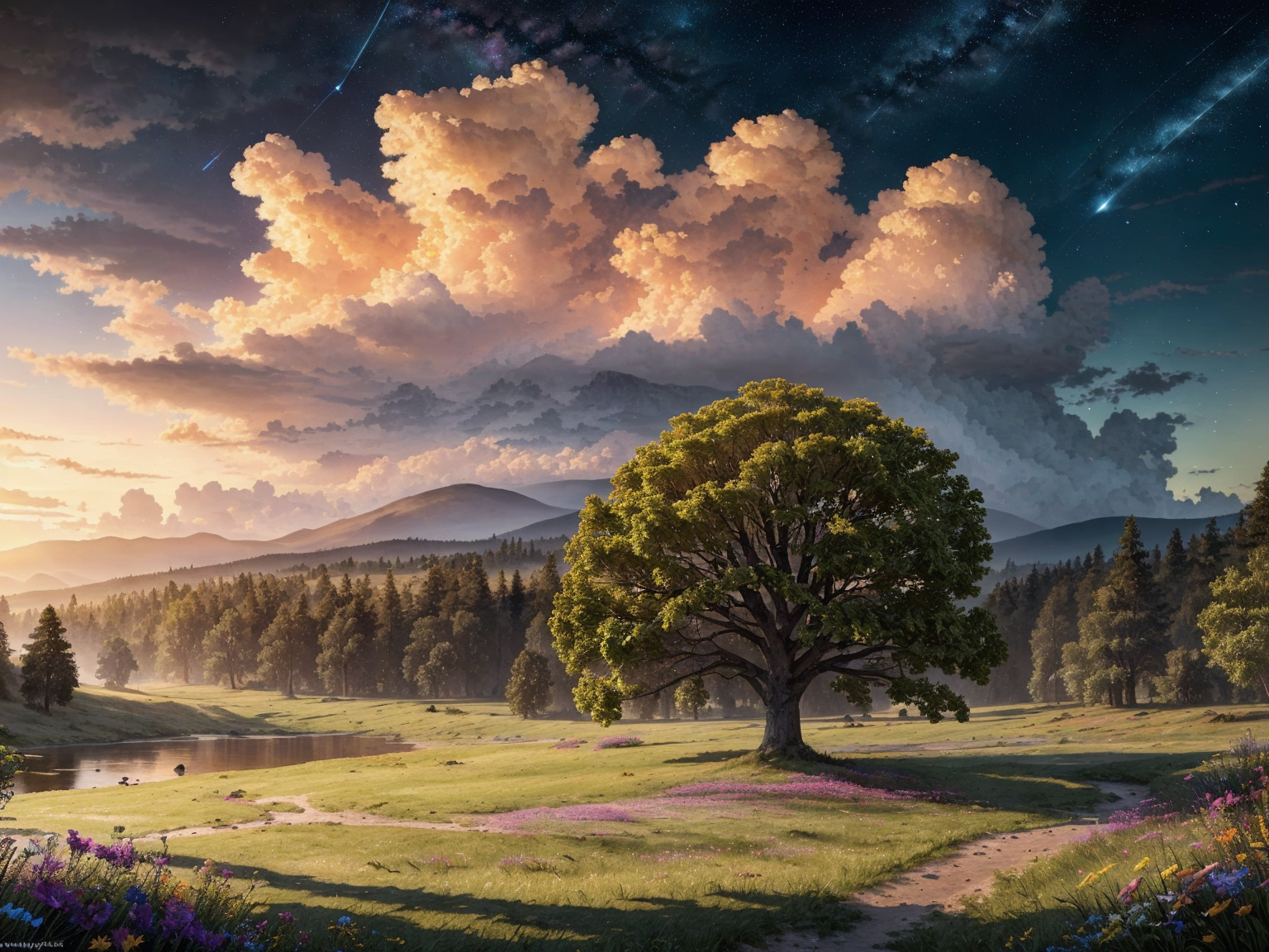 (Extremely Detailed Oil Painting:1.2), Impressionist painting sky,tree,cloud,scenery,outdoors,grasslands,lake,sunset,star \(sky\),flower,starry sky,cloudy sky,no humans,twilight,nature,wind,masterpiece,best quality,very aesthetic,absurdres <lora:StarryMountainWildernessV1.0:0.7> . Loose brushwork, vibrant color, light and shadow play, captures feeling over form, glow effects, godrays, Hand drawn, render, 8k, octane render, cinema 4d, blender, dark, atmospheric 4k ultra detailed, cinematic sensual, Sharp focus, humorous illustration, big depth of field, Masterpiece, colors, 3d octane render, 4k, concept art, trending on artstation, hyperrealistic, Vivid colors, extremely detailed CG unity 8k wallpaper, trending on ArtStation, trending on CGSociety, Intricate, High Detail, dramatic