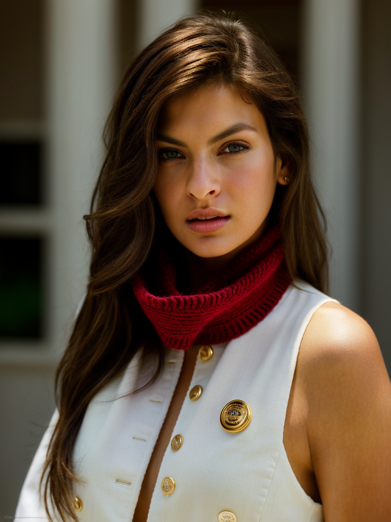 Realistic photo of a beautiful l1nd43 woman,1girl,solo,long hair,looking at viewer,brown hair,brown eyes,upper body,scarf,lips,buttons,realistic,badge,soft lighting, professional Photography, Photorealistic, detailed, RAW, analog, sharp focus, 8k, HD, high quality, masterpiece<lora:l1nd43:1.0>
