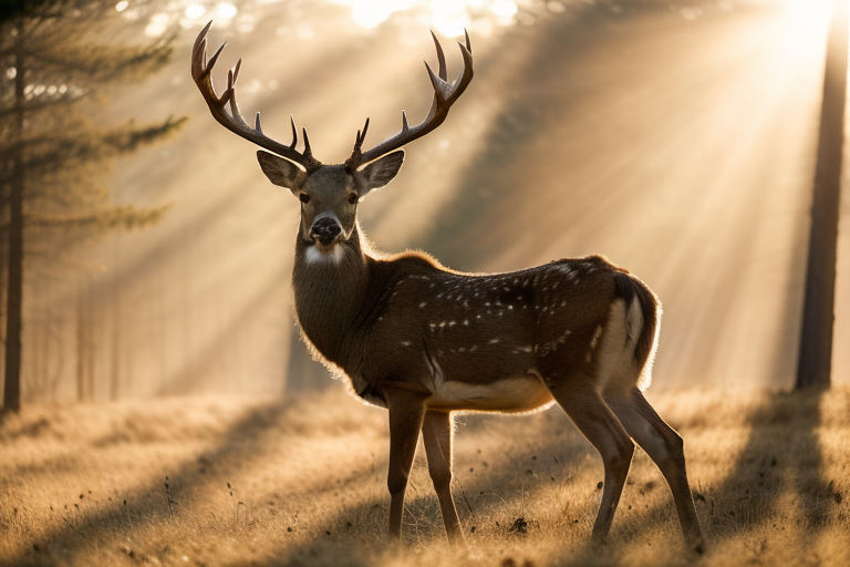 portrait of deer on the plain at the edge of the forest, Dawn, fog, golden hour, the sun shines among the woods, (backlit:1.3), (cinematic:1.2), textures, photo, detailed, hdr, 4k, realistic. color grading, sharp focus, ultra high quality