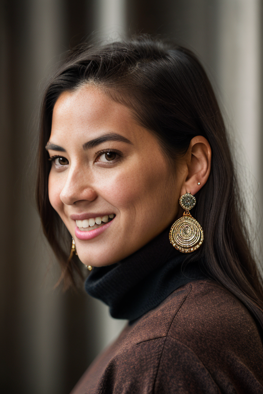 <lora:0l1v14m:1>, Realistic photo of a beautiful 0l1v14m woman, 1girl, solo, long hair, breasts, looking at viewer, smile, skirt, brown hair, black hair, long sleeves, brown eyes, jewelry, earrings, teeth, grin, sweater, lips, turtleneck, ring, freckles, realistic, soft lighting, professional Photography, Photorealistic, detailed, RAW, analog, sharp focus, 8k, HD, DSLR, high quality, Fujifilm XT3, film grain, award winning, masterpiece