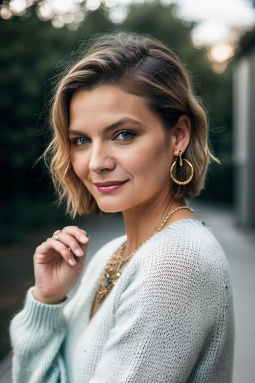 Realistic photo of a beautiful m1ch3ll3p-v2 woman, 1girl, solo, short hair, looking at viewer, smile, blue eyes, (((blonde hair))), simple background, long sleeves, jewelry, upper body, earrings, sweater, lips, ring, realistic, soft lighting, professional Photography, Photorealistic, detailed, RAW, analog, sharp focus, 8k, HD, DSLR, high quality, Fujifilm XT3, film grain, award winning, masterpiece<lora:m1ch3ll3p-v2:1.0>