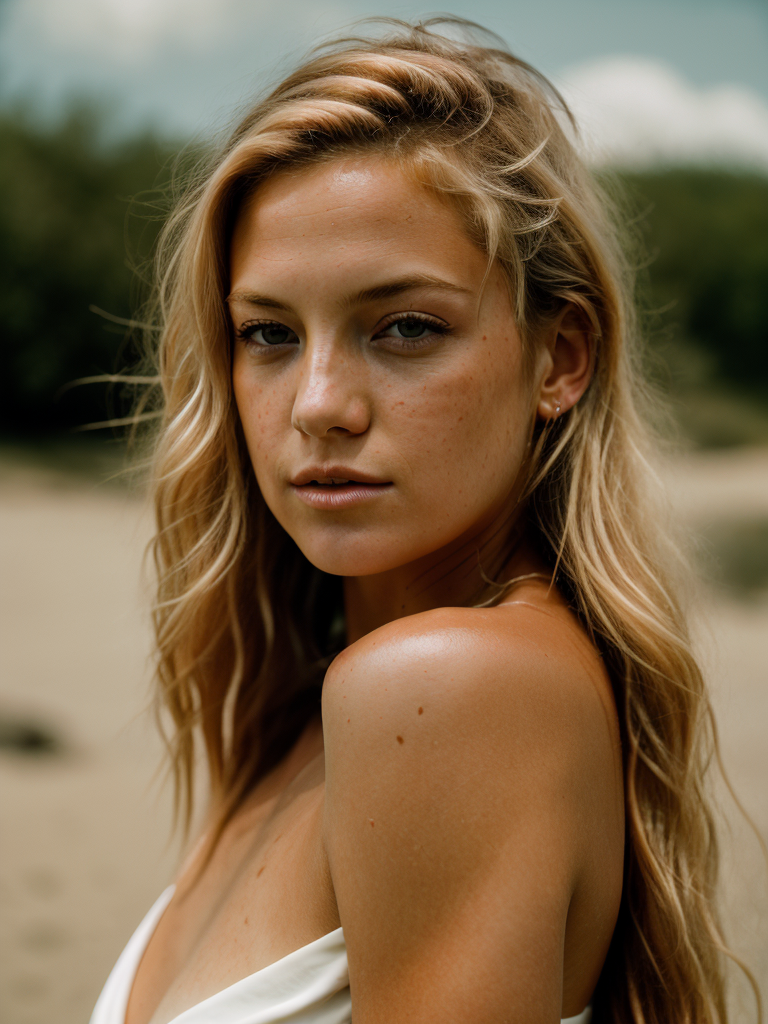 Realistic photo of a beautiful k4t3h-v2 woman, 1girl, solo, long hair, looking at viewer, (((blonde hair))), simple background, brown hair, bare shoulders, upper body, flat chest, lips, freckles, realistic, soft lighting, professional Photography, Photorealistic, detailed, RAW, analog, sharp focus, 8k, HD, DSLR, high quality, Fujifilm XT3, film grain, masterpiece<lora:k4t3h-v2:1.0>