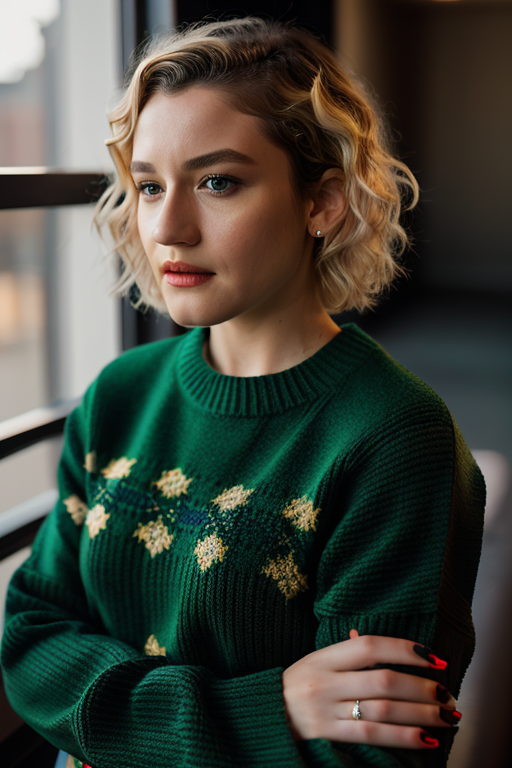 <lora:jul14g4rn3r:1>, Realistic photo of a beautiful jul14g4rn3r woman, 1girl, solo, looking at viewer, short hair, blonde hair, long sleeves, green eyes, upper body, pants, indoors, nail polish, blurry, sweater, lips, blurry background, black pants, crossed arms, curly hair, realistic, red sweater, soft lighting, professional Photography, Photorealistic, detailed, RAW, analog, sharp focus, 8k, HD, DSLR, high quality, Fujifilm XT3, film grain, award winning, masterpiece