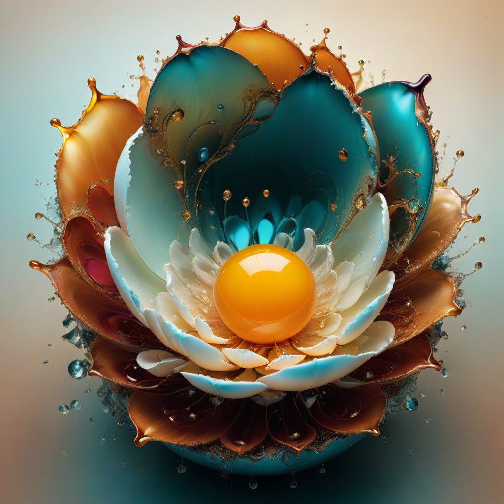 macro photography, 3d, a marvelous egg flower made by splash it on the floor, breathtaking, very unusual, epic, masterpiece, highly intricate, insane, digital painting, fluid, light particles, dreamy, alcohol ink, smooth, shimmering, dreamy glow, conceptual art by alberto seveso, salvador dali, anna dittmann, arthur rackham, 16k