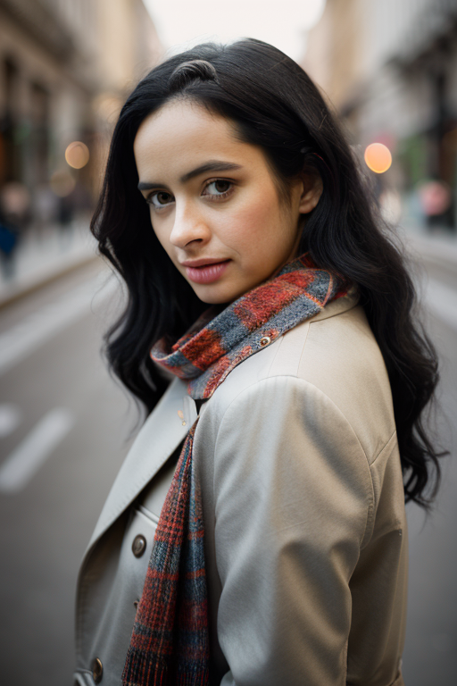 Realistic photo of a beautiful kryst3nr-v12 woman, 1girl, solo, long hair, black hair, brown eyes, upper body, parted lips, teeth, scarf, blurry, lips, coat, looking to the side, blurry background, looking away, realistic, soft lighting, professional Photography, Photorealistic, detailed, RAW, analog, sharp focus, 8k, HD, DSLR, high quality, Fujifilm XT3, film grain, award winning, masterpiece<lora:kryst3nr-v1:1.0>