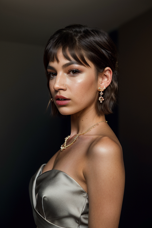 Realistic photo of a beautiful ursul4c-v1 woman, 1girl, solo, short hair, simple background, brown hair, dress, bare shoulders, brown eyes, jewelry, collarbone, upper body, earrings, grey background, black dress, lips, see-through, looking to the side, strapless, realistic, soft lighting, professional Photography, Photorealistic, detailed, RAW, analog, sharp focus, 8k, HD, DSLR, high quality, Fujifilm XT3, film grain, award winning, masterpiece<lora:ursul4c-v1:1.0>
