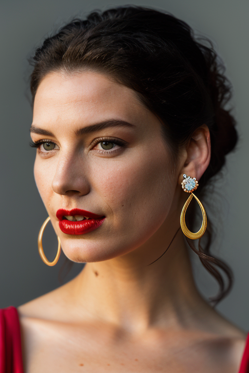 Realistic photo of a beautiful j3ss1c4p-v1 woman, 1girl, solo, long hair, looking at viewer, simple background, black hair, jewelry, earrings, parted lips, teeth, grey background, mole, lips, makeup, lipstick, portrait, mole under mouth, realistic, red lips, soft lighting, professional Photography, Photorealistic, detailed, RAW, analog, sharp focus, 8k, HD, DSLR, high quality, Fujifilm XT3, film grain, award winning, masterpiece<lora:j3ss1c4p-v1:1.0>