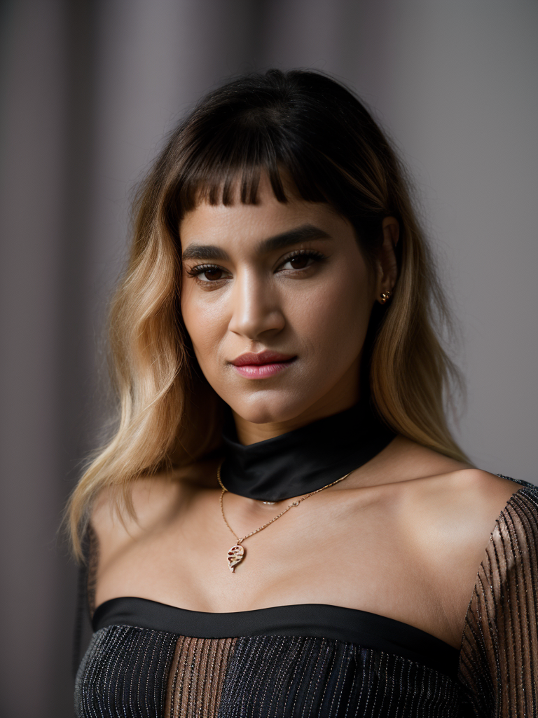 Realistic photo of a beautiful s0f14b woman,1girl,solo,breasts,looking at viewer,bangs,blonde hair,long sleeves,dress,brown eyes,jewelry,striped,belt,medium hair,necklace,nail polish,black dress,lips,makeup,black nails,hands on hips,soft lighting, professional Photography, Photorealistic, detailed, RAW, analog, sharp focus, 8k, HD, high quality, masterpiece<lora:s0f14b:1.0>
