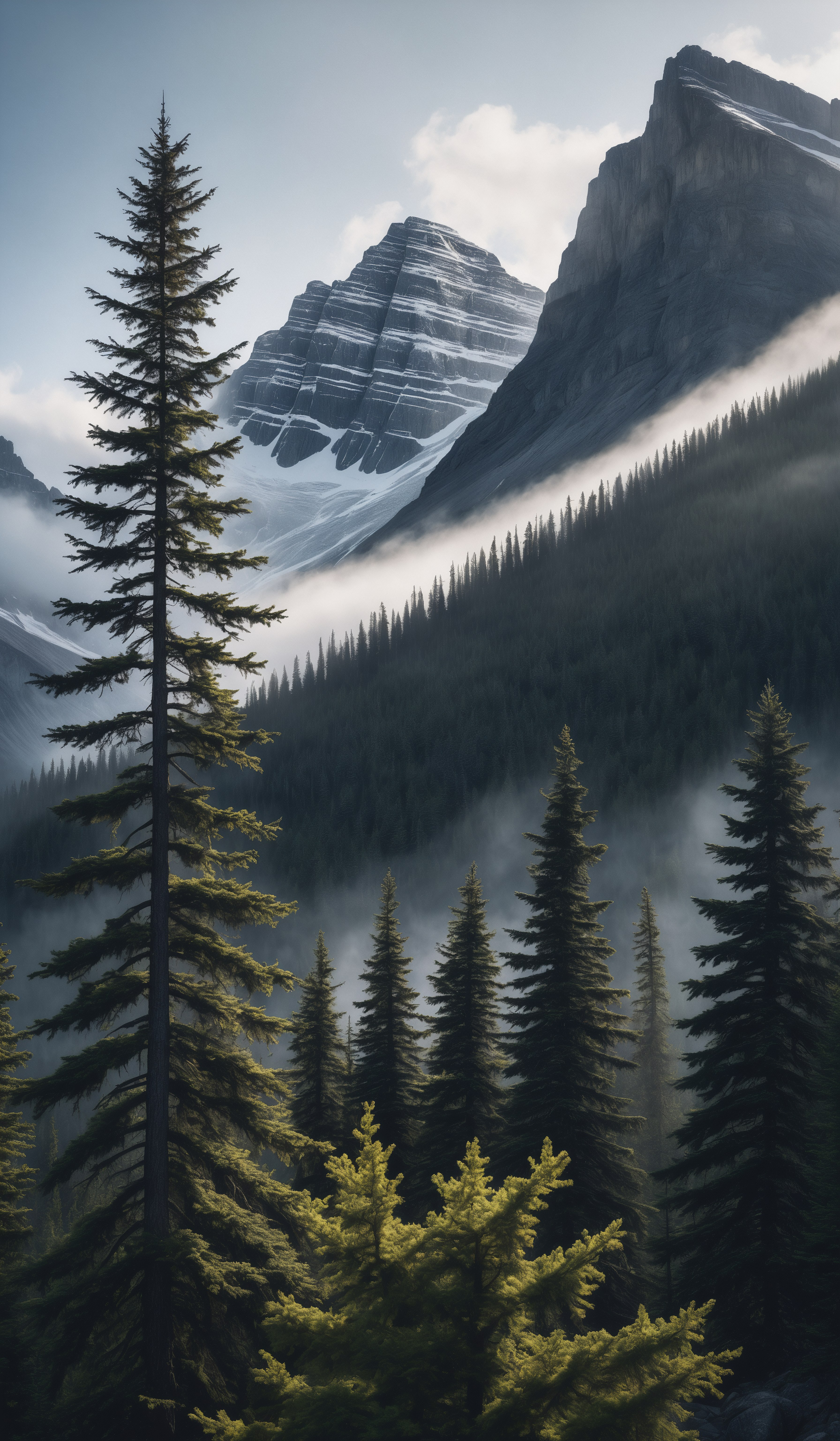 Banff national park foggy mountains and forest in Canada., (sharp focus:1.2), extremely detailed, (photorealistic:1.4), (RAW image, 8k high resolution:1.2), RAW candid cinema, 16mm, color graded Portra 400 film, ultra realistic, subsurface scattering, ray tracing, (volumetric lighting), extreme contrast, intricate details, reflections