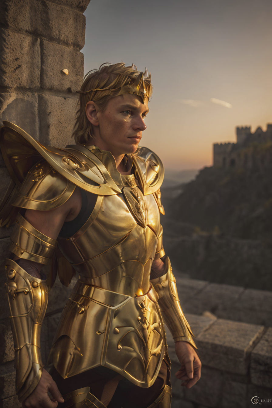 best quality close up portrait of an heroic man, in medieval armor with short blonde hair, near a faraway castle at sunset. (full body armor), (detailed armor, golden armor, high quality), (wings armor) (ornate armor), (gauntlet), (hdr), (noble), inspiring, film grain, cinematic lighting, (hight detailed skin), <lora:SagittariusArmor:0.65> <lora:polyhedron_skinny_all:0.5>