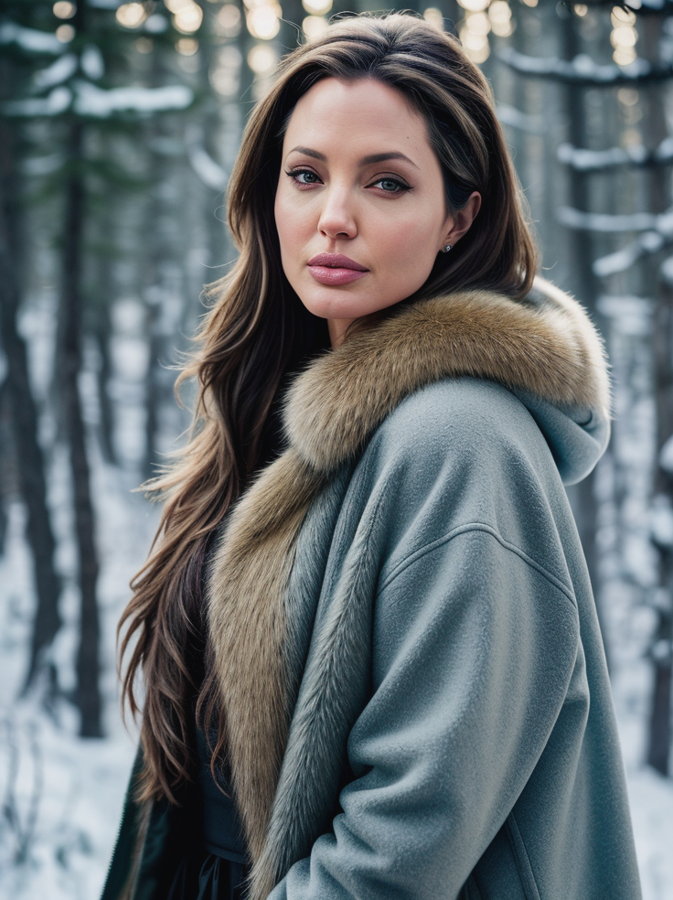 beautiful woman ( 4nj0lie:.99), beautiful hair, winter forest, snowing, natural skin texture, fashionable fur coat, 24mm, 4k textures, soft cinematic light, adobe lightroom, photolab, hdr, intricate, elegant, highly detailed, sharp focus, ((((cinematic look)))), soothing tones, insane details, intricate details, hyperdetailed, low contrast, soft cinematic light, exposure blend, hdr, faded