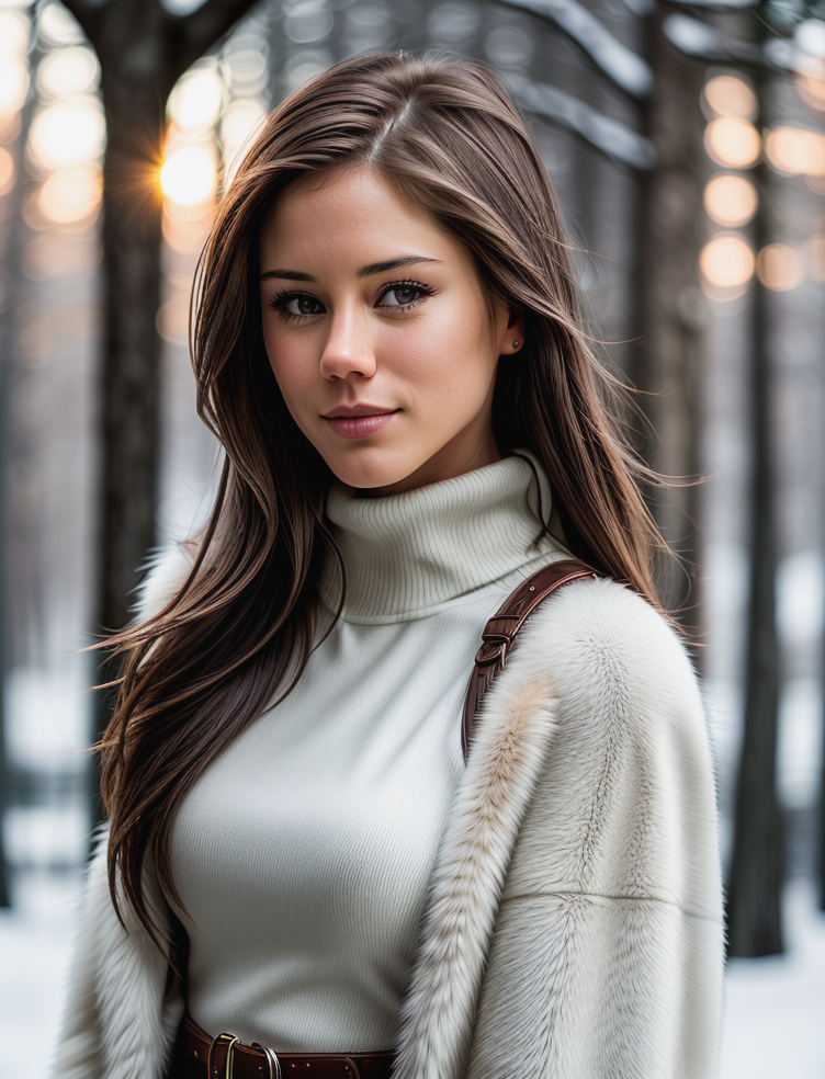 beautiful woman (dld_lcaprice:.99), beautiful hair, winter forest, elegant, snowing, natural skin texture, (fashionable fur coat), (turtleneck), sunset, cute smile, (Looking back over shoulder), 24mm, 4k textures, soft cinematic light, adobe lightroom, photolab, hdr, intricate, elegant, highly detailed, sharp focus, ((((cinematic look)))), soothing tones, insane details, intricate details, hyperdetailed, low contrast, soft cinematic light, exposure blend, hdr, faded, <lora:more_details:.6>, <lora:wowifierV3:.6>
