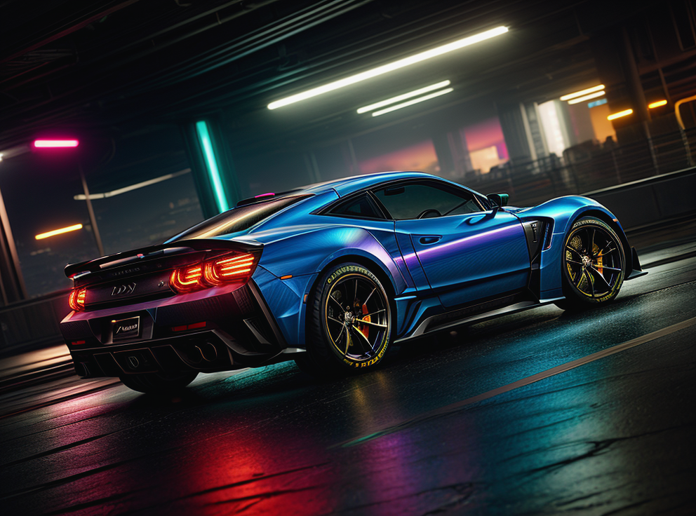 cyberpunk 2077 iridescent color expensive sports car with gear and guns attached, dirty, in cyberpunk 2077 urban photoshoot, sunset, running at high speed, glowing lights, speed sensation, well framed at middle range, (knobby tires), slammed, extreme detail, illegal battle car, extreme photorealistic, 3D, 8k, Hyper detailed car, perfect soft lighting, great lighting, car photography, fisheye lens, raining, reflection, octane render, high quality, <lora:more_details:1.2>
