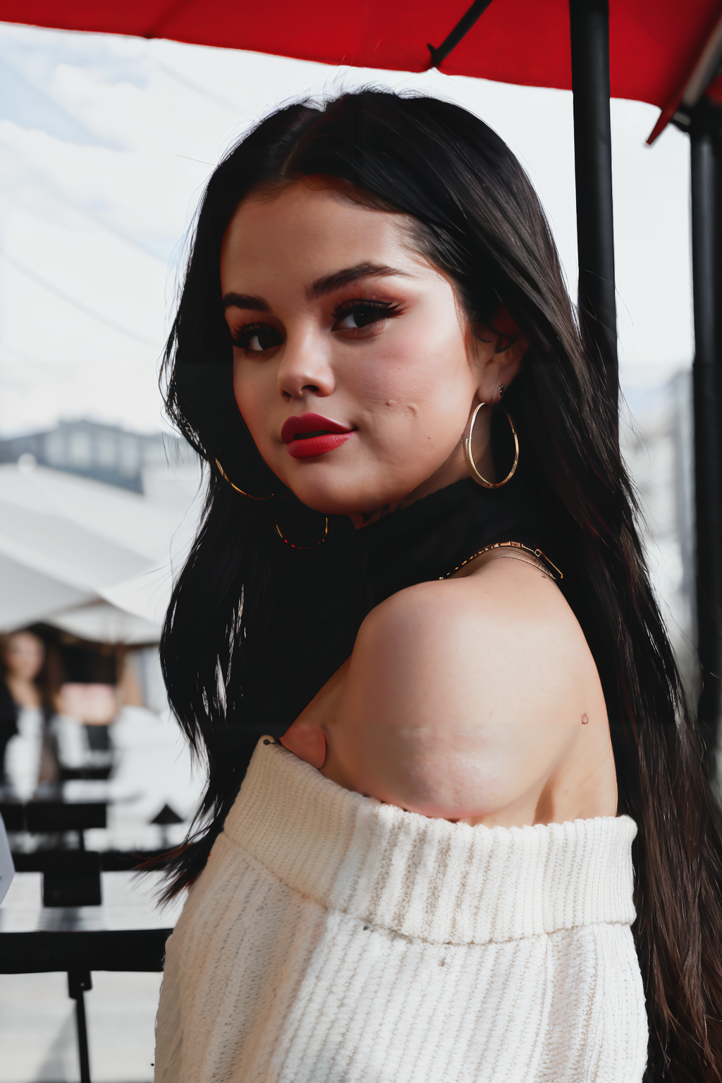 selenaGomez1 piercing eyes, looking straight, very happy,long hair, wearing an off-shoulder sweater, choker, closeup portrait, in a outdoor cafe in 2015, afternoon light