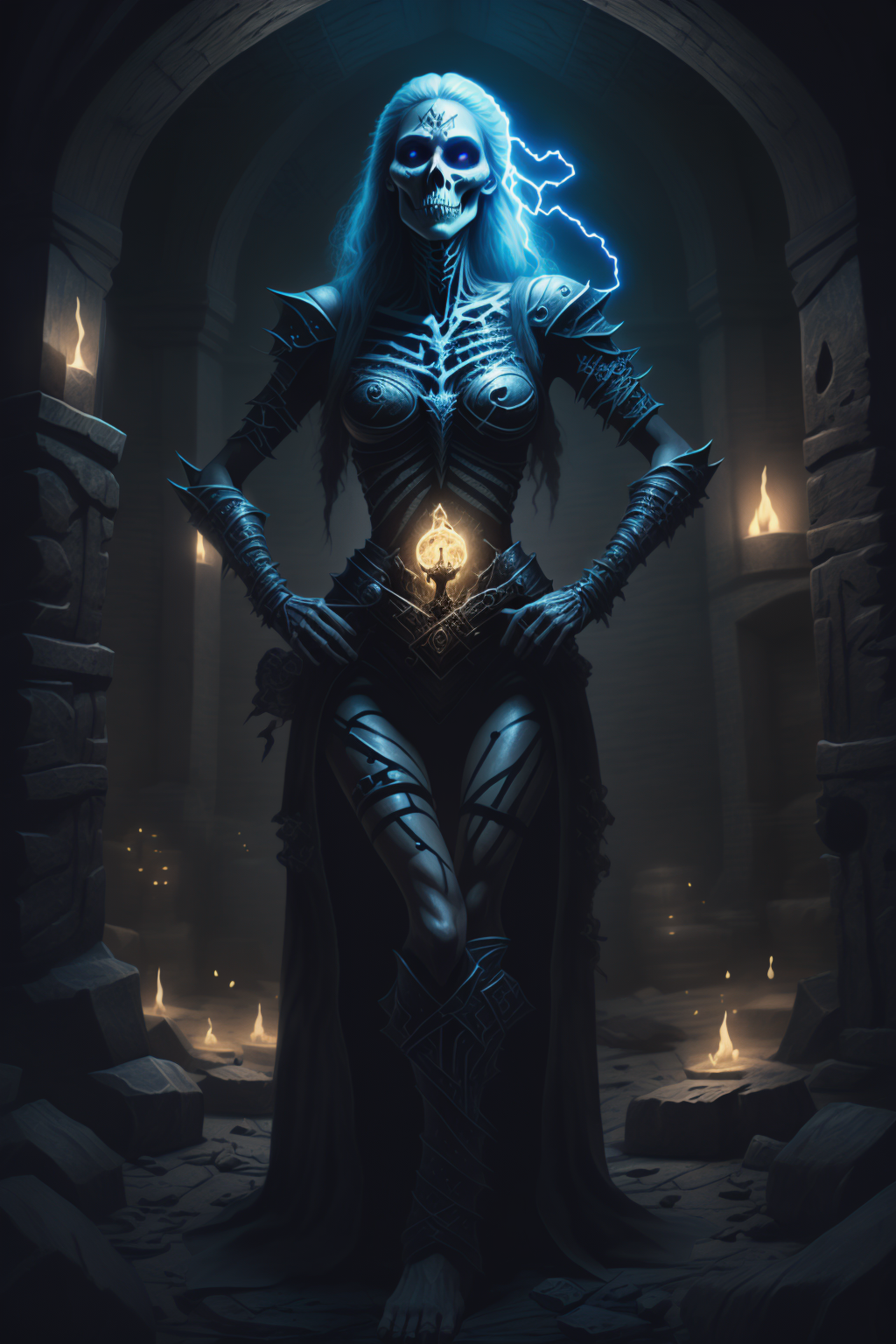 fantchar, a powerful skeletal mage woman with lightning crackling around her standing in a dungeon crypt, beautiful, runes, symbols, glowing, realistic, highly detailed, intricate