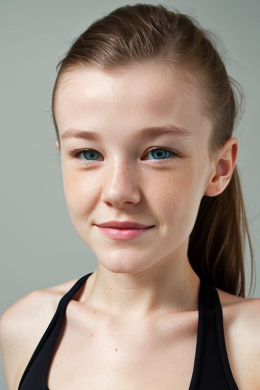 (CR-3milyBloom-Denche354:0.9), full color face closeup photo of woman wearing tank top, grey background, (slick hair:1), oiled shiny skin,