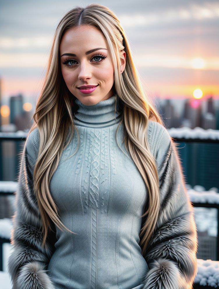 beautiful woman (1ucyc4t:.99), beautiful hair, winter New York, elegant, snowing, natural skin texture, (fashionable fur coat), (((turtleneck))), sunset, cute smile, 24mm, 4k textures, soft cinematic light, adobe lightroom, photolab, hdr, intricate, elegant, highly detailed, sharp focus, ((((cinematic look)))), soothing tones, insane details, intricate details, hyperdetailed, low contrast, soft cinematic light, exposure blend, hdr, faded, <lora:more_details:.6>, <lora:wowifierV3:.6>