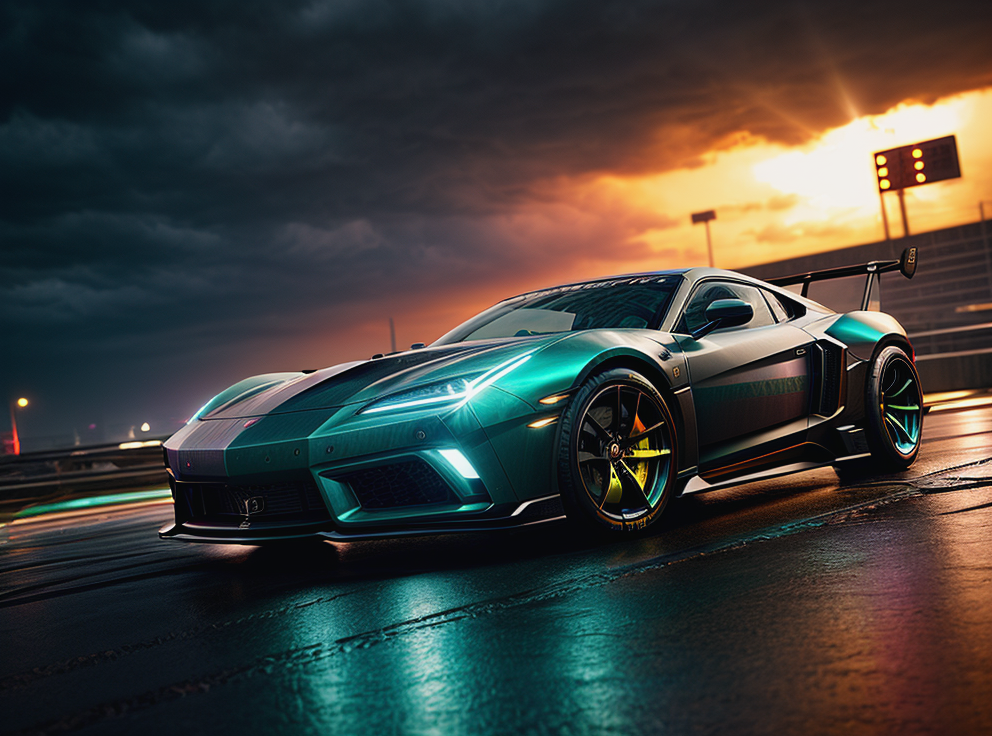 cyberpunk 2077 iridescent color expensive sports car with gear and guns attached, dirty, in cyberpunk 2077 urban photoshoot, sunset, running at high speed, glowing lights, speed sensation, well framed at middle range, (knobby tires), slammed, extreme detail, illegal battle car, extreme photorealistic, 3D, 8k, Hyper detailed car, perfect soft lighting, great lighting, car photography, fisheye lens, raining, reflection, octane render, high quality, <lora:more_details:1.2>