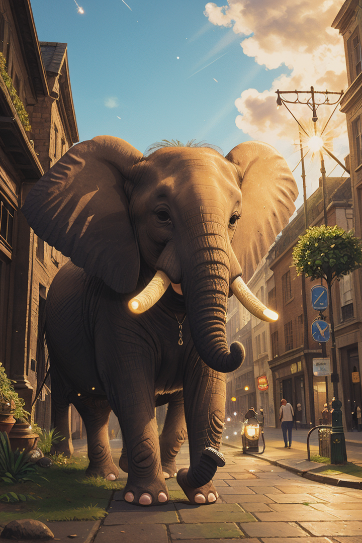 (close-up:1.3) elephant, on A bustling, old-world London street, nature, (natural elements), (particle effects),glow sprite, with a glowing, <lora:COOLKIDS_MERGE_V2.5:1>, <lora:add_sharpness:0.5>