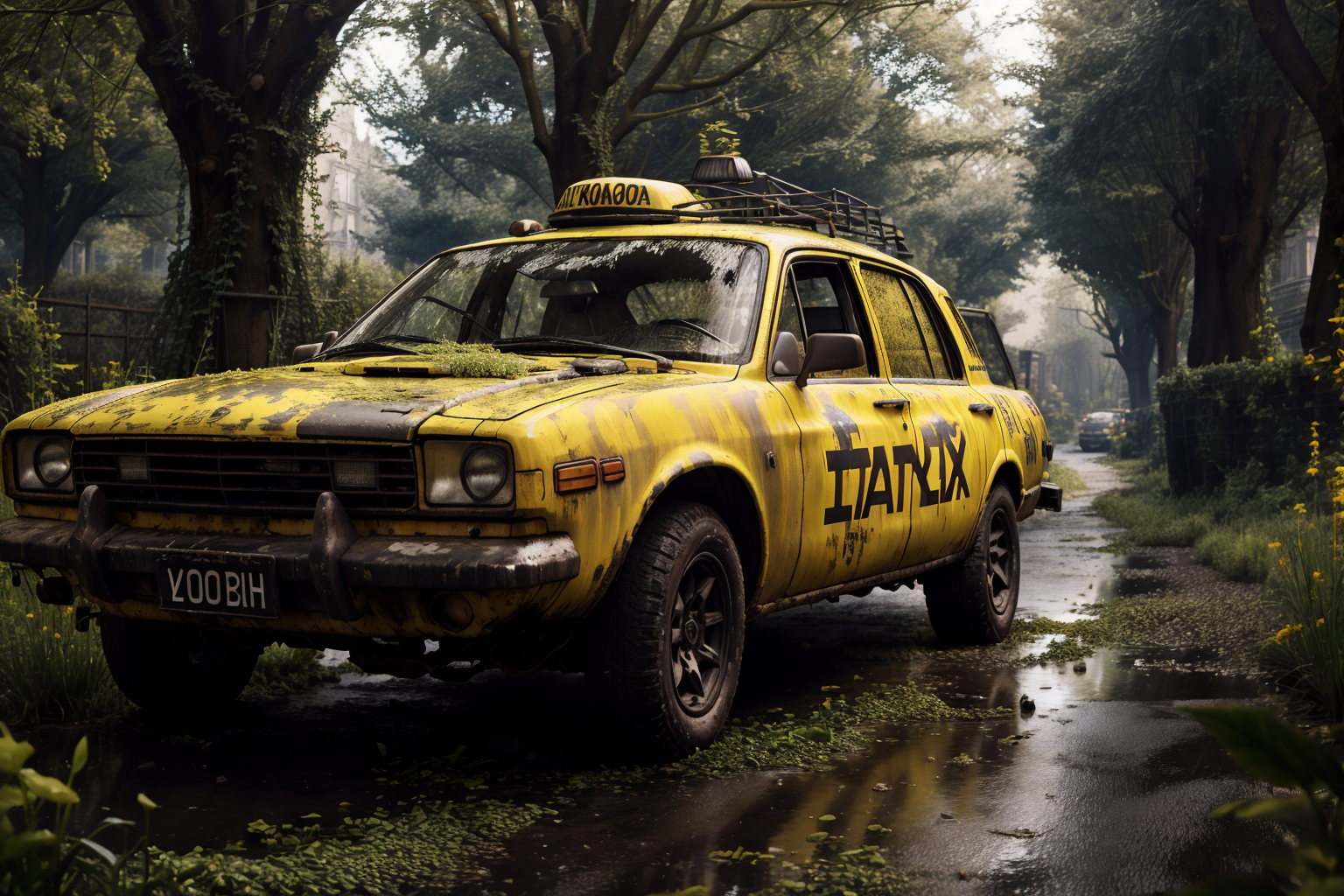 8k, realistic, vray, HDR, 6000K, yellow taxi, england, overgrown <lora:PostApocalyptic_v3-000007:0.6> SZ_4po enviroment