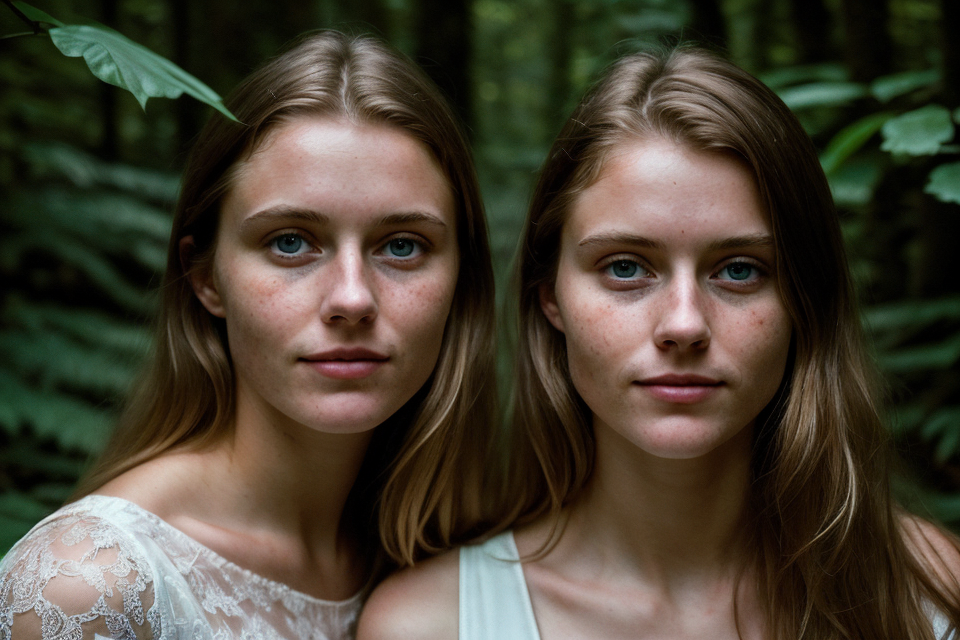 hyper realistic photograph, film grain, Kodak portra 800, f1.8, close up of two beautiful 18yo danish women, walking through a dense forest, haze, fog, dim diffuse light, detailed faces, beautiful faces, beautiful eyes, piercing eyes, gaunt, tired, dehydrated, crazy smile, unhinged, psychopathic
