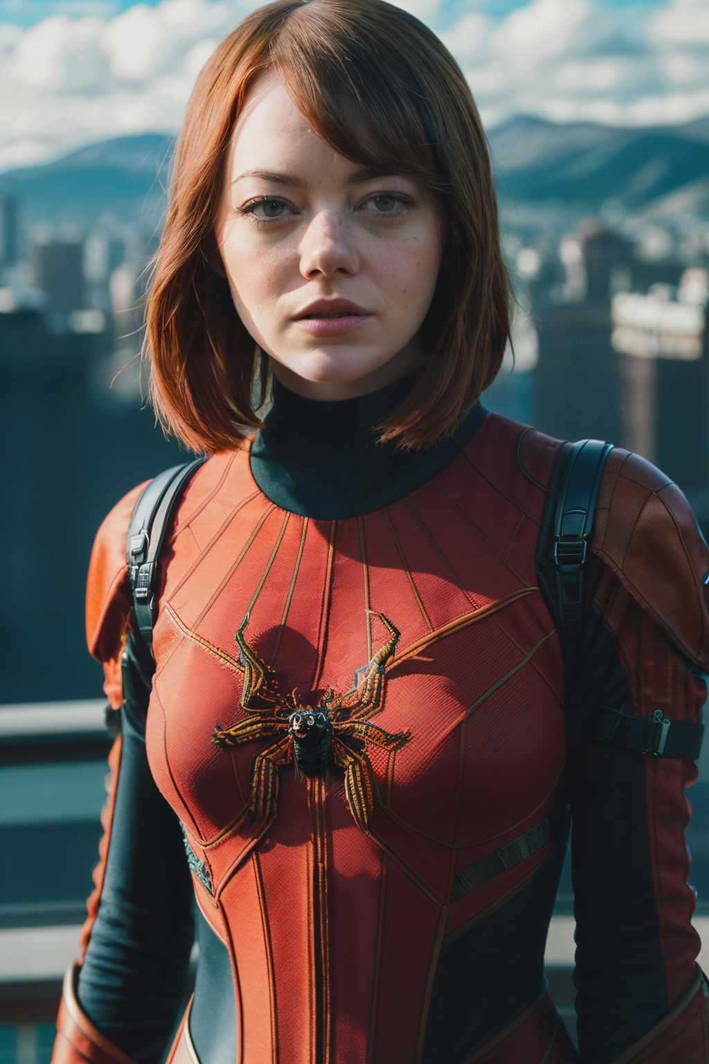 A stunning intricate full color portrait of emmaSto1, wearing spider woman costume, epic character composition, by ilya kuvshinov, alessio albi, nina masic, sharp focus, natural lighting, subsurface scattering, f2, 35mm