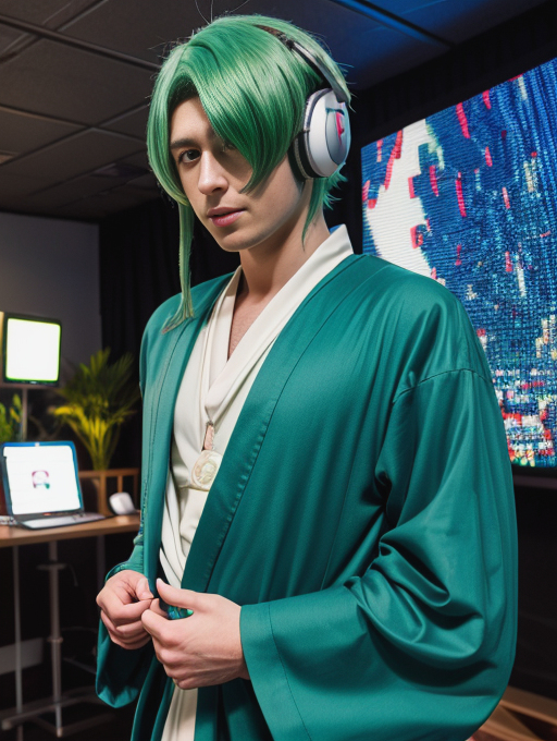 best quality, masterpiece, highres, detailed, <lora:Detail - add_detail:0.2>, JinkiV, green hair, headphones, red eyes, outdoors, cosplay convention, <lora:JinkiV-10:0.7>, 1boy, green robes, indoors, screens, sci-fi, hair over eyes, green clothing, cosplay, wig,
