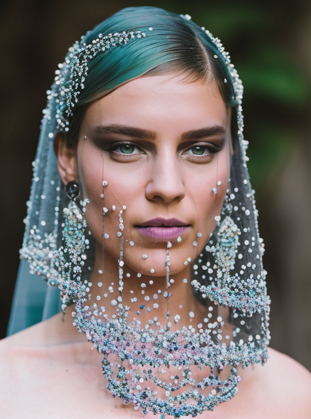 RAW photo, subject, 8k uhd, dslr, high quality, film grain, Fujifilm XT3, professional photo, (detailed skin:1.3), high quality, <lora:Beaded_Veil:0.8> , beaded veil, wearing beaded veil, hard shadows, detailed veil, pastel colors, limited palette, light purple, light turquoise, aqua, orchid color, portrait, upper body, lavender color, purple eyes,