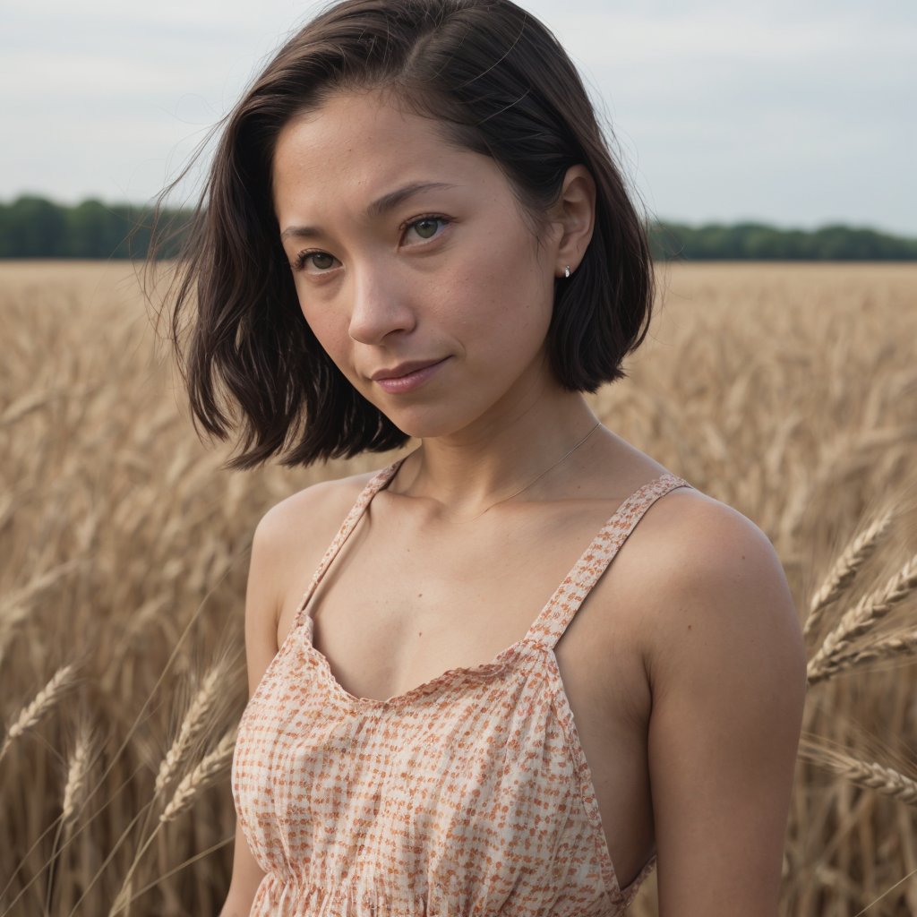 closeup picture of lilykawaii, wearing sundress, standing in wheat field, looking_at_viewer, photorealistic
