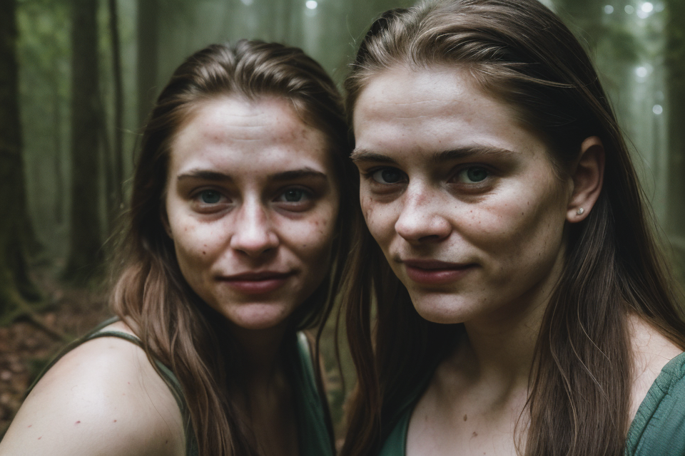 hyper realistic photograph, film grain, Kodak portra 800, f1.8, close up of two beautiful 18yo orc women, walking through a dense forest, haze, fog, dim diffuse light, detailed faces, beautiful faces, beautiful eyes, piercing eyes, gaunt, tired, dehydrated, crazy smile, unhinged, psychopathic