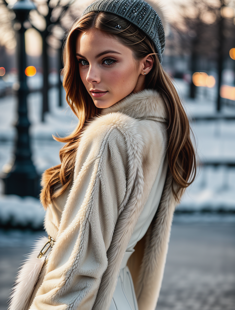 beautiful woman (c4rmr0se:.99), beautiful hair, winter Paris, elegant, snowing, natural skin texture, ((fashionable fur coat)), (turtleneck), sunset, cute smile, (Looking back over shoulder), 24mm, 4k textures, soft cinematic light, adobe lightroom, photolab, hdr, intricate, elegant, highly detailed, sharp focus, ((((cinematic look)))), soothing tones, insane details, intricate details, hyperdetailed, low contrast, soft cinematic light, exposure blend, hdr, faded<lora:more_details:.6> <lora:wowifierV3:.6>