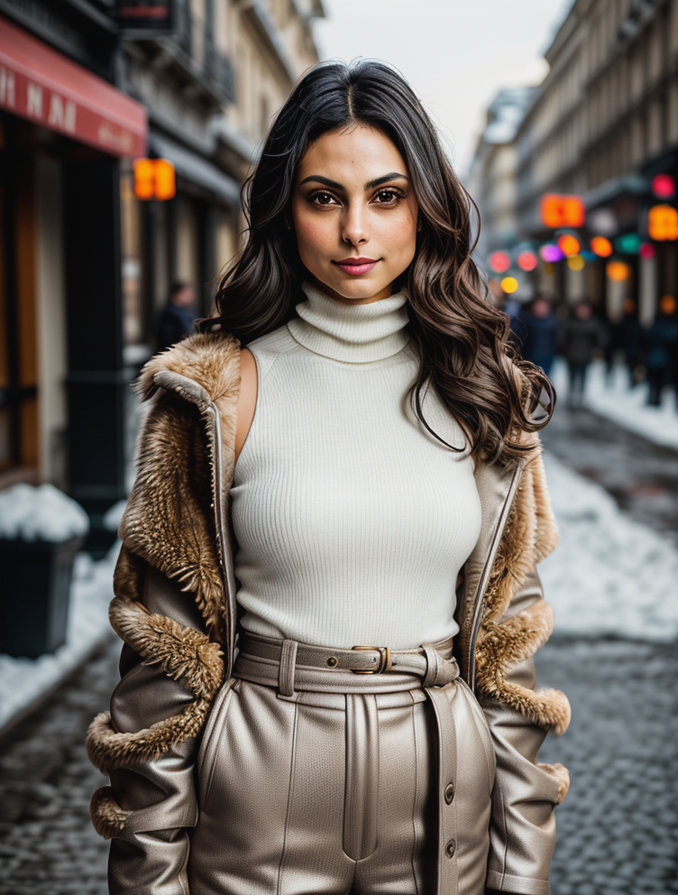 beautiful woman (morb4cc4r1n:.99), beautiful hair, winter Paris, elegant, snowing, natural skin texture, (fashionable fur coat), ((turtleneck)), ((designer pants)), sunset, cute smile, 24mm, 4k textures, soft cinematic light, adobe lightroom, photolab, hdr, intricate, elegant, highly detailed, sharp focus, ((((cinematic look)))), soothing tones, insane details, intricate details, hyperdetailed, low contrast, soft cinematic light, exposure blend, hdr, faded<lora:more_details:.6> <lora:wowifierV3:.6>