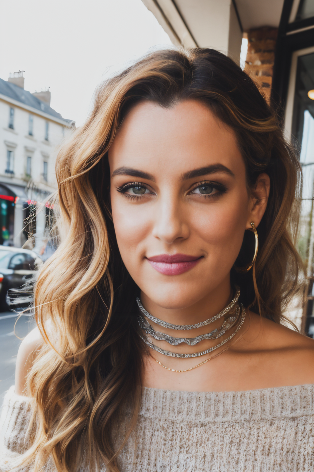 rkh piercing eyes, looking straight, very happy,wavy hair, wearing an off-shoulder sweater, choker, closeup portrait, in a outdoor cafe in 2015, afternoon light,<lyco:RileyKeough-RealVision-V1.0:1.0>