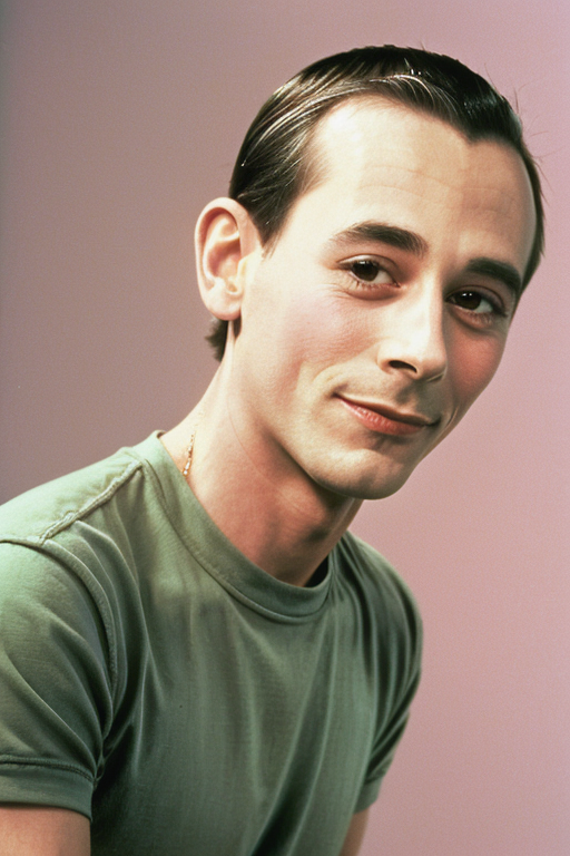 PeeWeeHerman, 1man, portrait, (masterpiece, best quality, extremely detailed, photorealistic), narrow body, skinny, wild colors, (closeup on upper body:1.3)