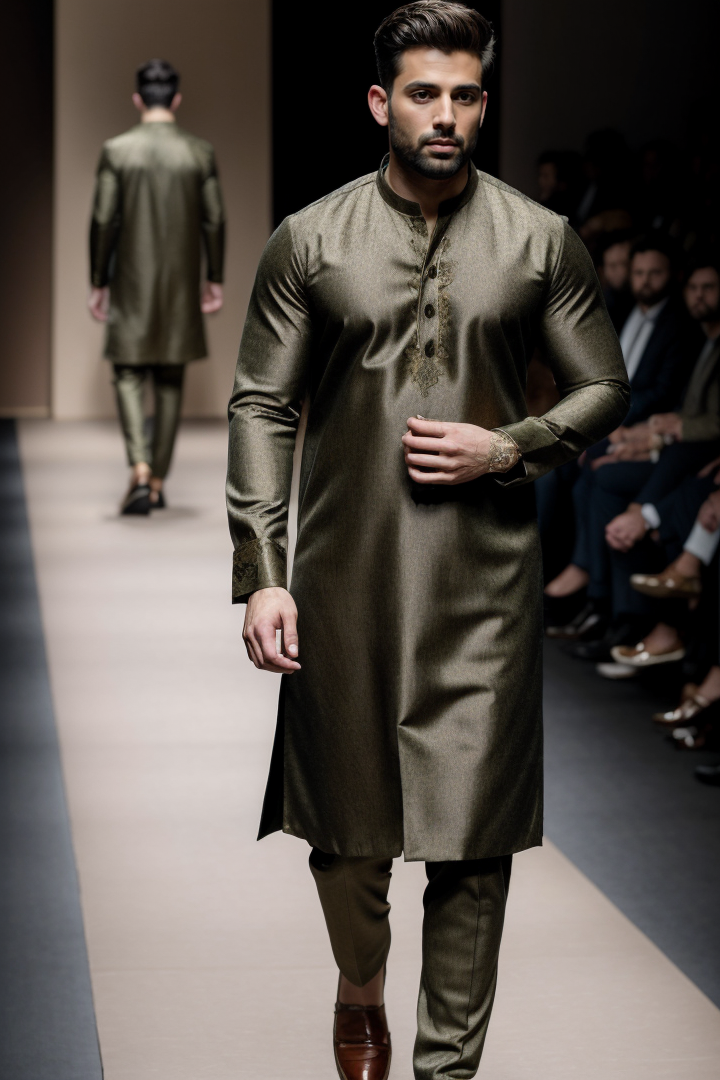 ((best quality)), ((masterpiece)), ((ultra realistic)),(dynamic sexy pose), masterpiece trending on art station of a beautiful Pakistani male model walks down the runway at the fashion show during Milan Fashion week in Milan, Italy, motion blur, wearing a xyzsankurta, (highly detailed:1.3), Dark Olive Green Kurta, Shalwar, Shoes, <lora:xyzsankurta:0.8>, professional, moody cinematic lighting, masterpiece, realistic, roughness, ultra realistic, masterpiece, realistic, roughness, ultra realistic, (bokeh:1.3), photographed on a Canon EOS R5, 50mm lens, muted colors, F/2.8, HDR, 8k resolution, highres, high detail, sharp focus, smooth, roughness, real life, photorealism, photography, 8k uhd, (motion blur:1.001), <lora:add_detail:0.5> <lyco:GoodHands-beta2:1.0>