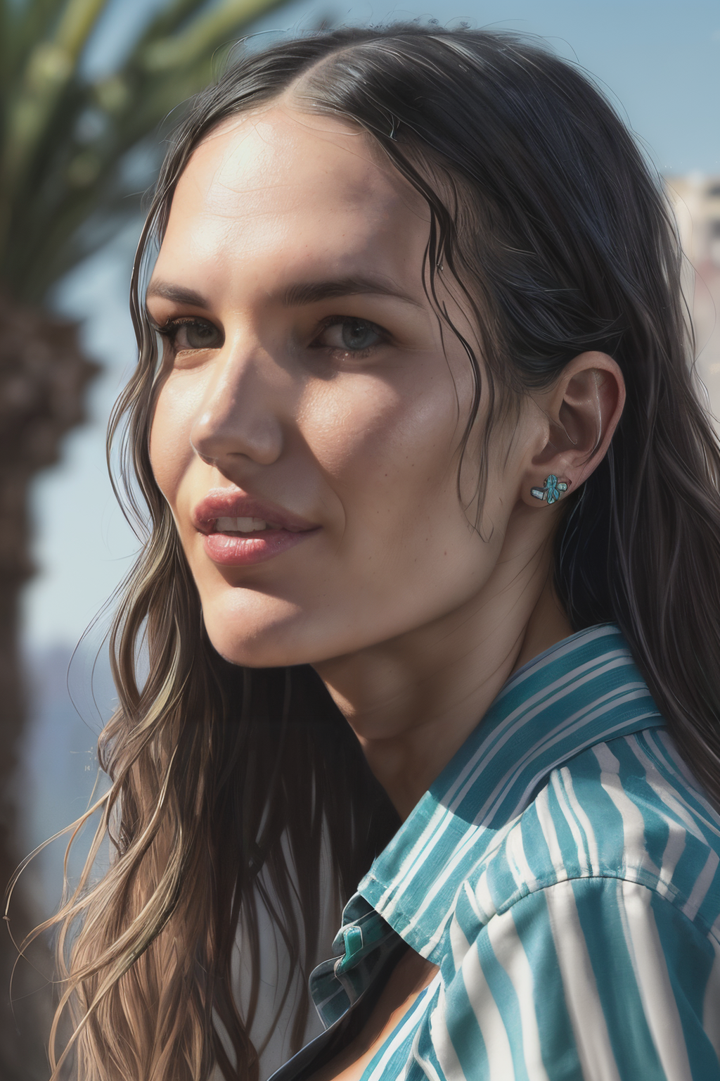 portrait photo of evaBarg1,(blue and green striped shirt), alluring portrait, intricate, highly detailed, digital painting, artstation, concept art, naughty, sharp focus, cinematic lighting, illustration, art by artgerm and greg rutkowski, alphonse mucha, cgsociety