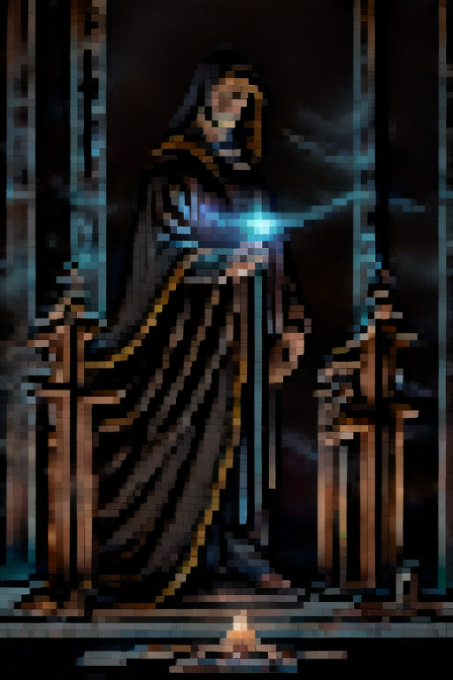 ominous man in a dark purple cloak and glowing eyes, indoor stone brick masonry, candlelight, priest cross necklace, doom, darkness