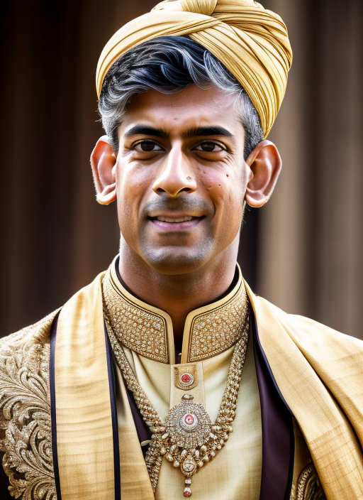 (masterpiece, best quality, awards winner) (illustration), (masterpiece), (best quality), (detailed), close up portrait Rishi Sunak as indian raja, golden neckless, 8k, hdri, hyperelistic, ultrashrp, <lora:sunak:1>