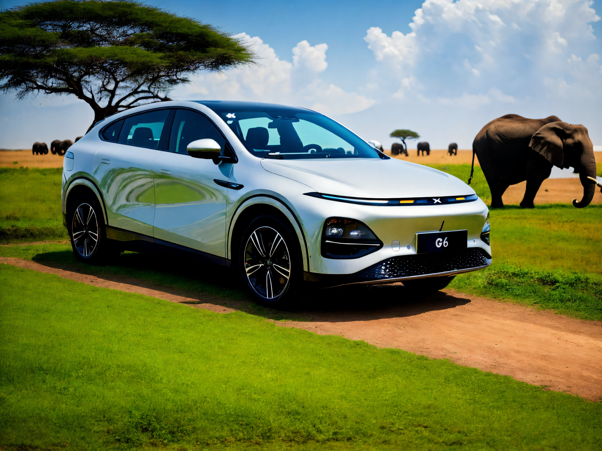 RAW photo, XPeng G6, wide view of a car parked in a distance in grassland in Africa, with an elephant in the blurred background <lora:xpeng_v1.2:0.9>, (high detailed skin:1.2), 8k uhd, dslr, soft lighting, high quality, film grain, Fujifilm XT3
