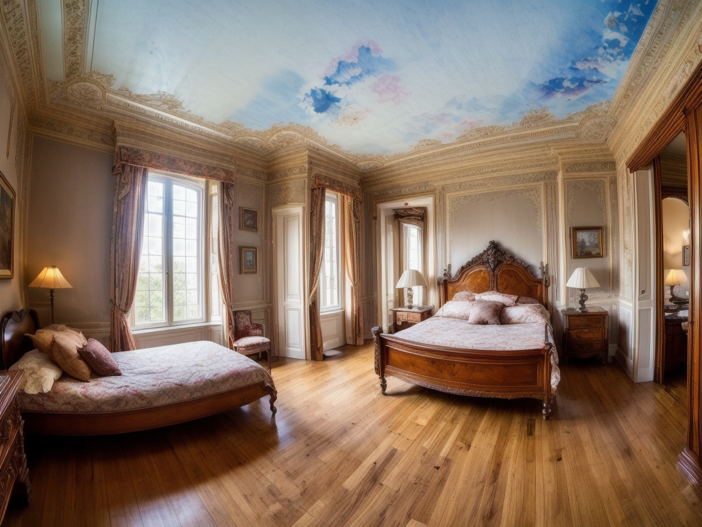 long shot scenic professional photograph of photo of a precious (richly furnished) Art Nouveau bedroom (trompe l'oeil:1.2), (wooden floor), highly detailed. sharp focus, depth of field <lora:add_detail:0.86>, RAW photo, full sharp, detailed face (high detailed skin:1.2), 8k uhd, dslr, soft lighting, high quality, film grain, Fujifilm XT3, perfect viewpoint, highly detailed, wide-angle lens, hyper realistic, with dramatic sky, polarizing filter, natural lighting, vivid colors, everything in sharp focus, HDR, UHD, 64K