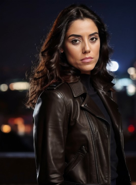 (realistic RAW portrait) of cansu_dere as a beautiful female model, georgia fowler, beautiful face, with short dark brown hair, in cyberpunk city at night. She is wearing a leather jacket, black jeans, dramatic lighting, (police badge:1.2) <lora:cansu_dere-000006:0.9>,